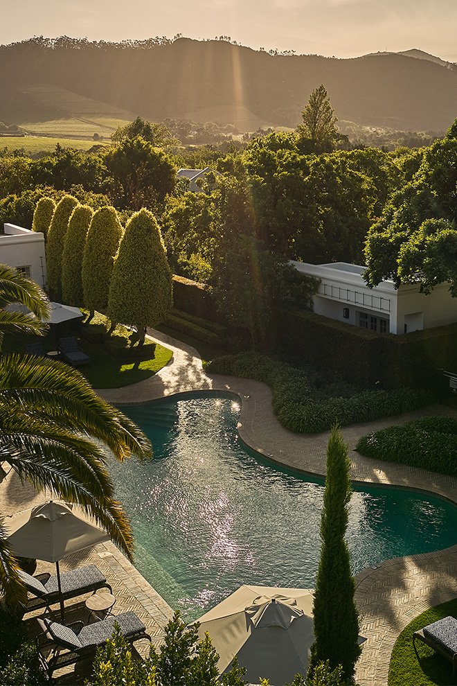 リーウ・ハウスは、フランシュフック村の中心にありながら、まるで長い年月をかけて丁寧に熟成されたかのような落ち着きを感じさせるホテルです。並木道に面した左右対称の白い外観の奥には、静かな中庭に囲まれた庭園が広がり、インテリアはフランスのエッセンスを感じさせる洗練された佇まいです。ワインメーカーの美意識が息づくこの谷に、これ以上ないほどふさわしい舞台と言えるでしょう。
