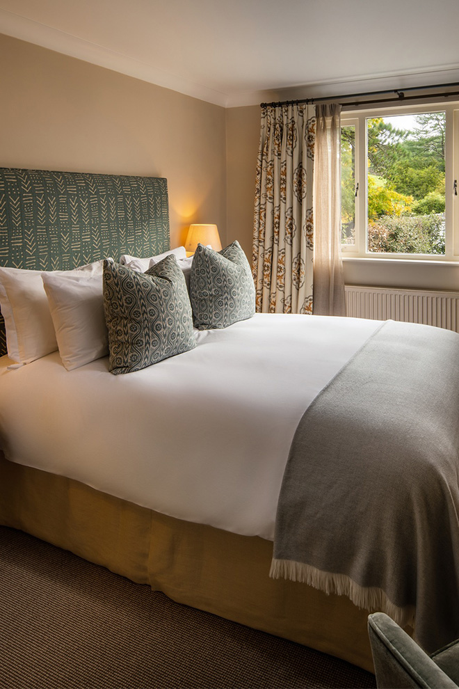 客室からは庭、コートヤード、湖を望め、「フェル・ビュー・スイート」には、散策や探検の後に体を癒すプライベート・ホットタブが備わっています。敷地内には彫刻が木々の間にさりげなく配置され、ブール・ピッチや巨大なチェス盤が、ゆったりとした時間を誘います。