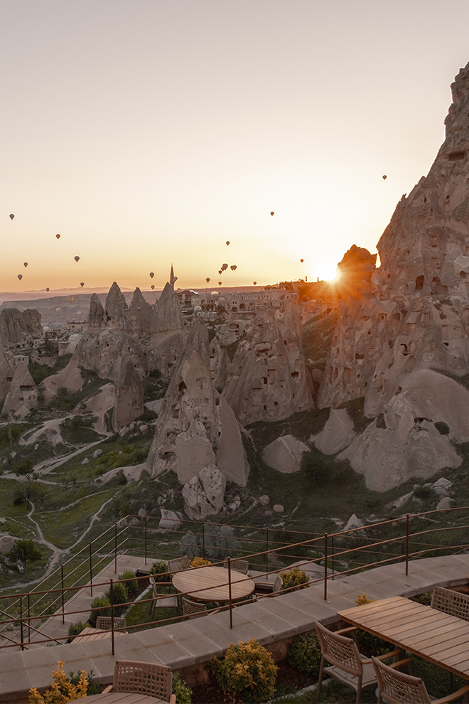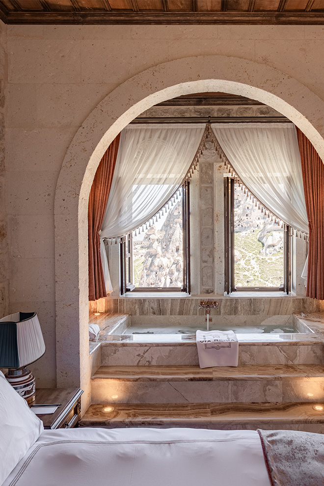 アーチ状の窓からは、動くフレスコ画のように風景が切り取られ、ウチヒサール城のそばに立つ妖精の煙突、柔らかな岩に刻まれた谷、刻々と色を変える地平線が広がります。